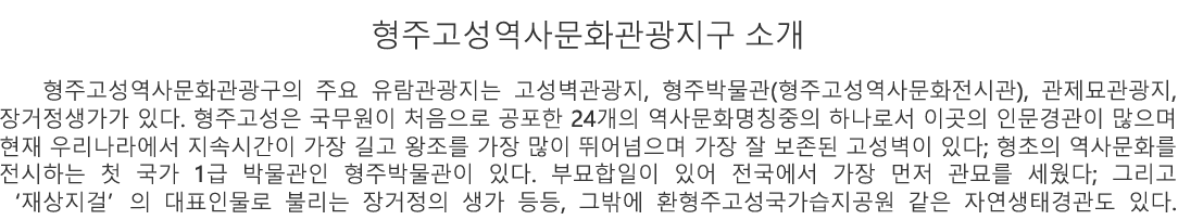 형주고성은 국무원이 처음으로 발표한 24개의 역사 문화 도시 중 하나이며, 중국의 우수한 관광 도시, 초나라 문화의 발상지, 삼국 문화의 고향이다