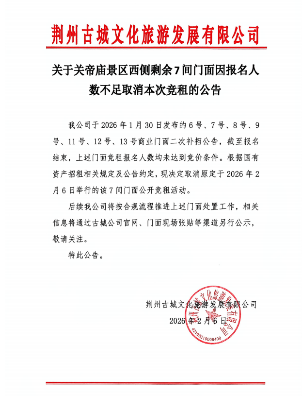 关于关帝庙景区西侧剩余7间门面因报名人数不足取消本次竞租的公告