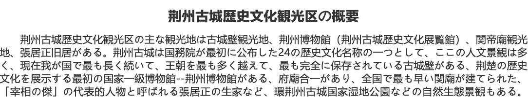 荊州古城は国務院が初めて公布した24の歴史文化名城の一つであり、中国の優れた観光都市、楚文化の発祥地、三国文化の故郷である